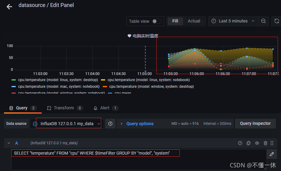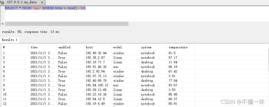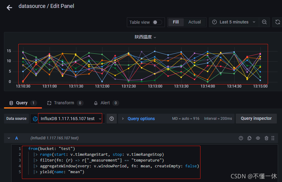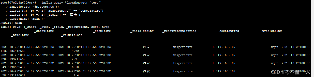 例如,查询 test 数据库 temperature 表,field 为西安的最近 5 分钟的数据