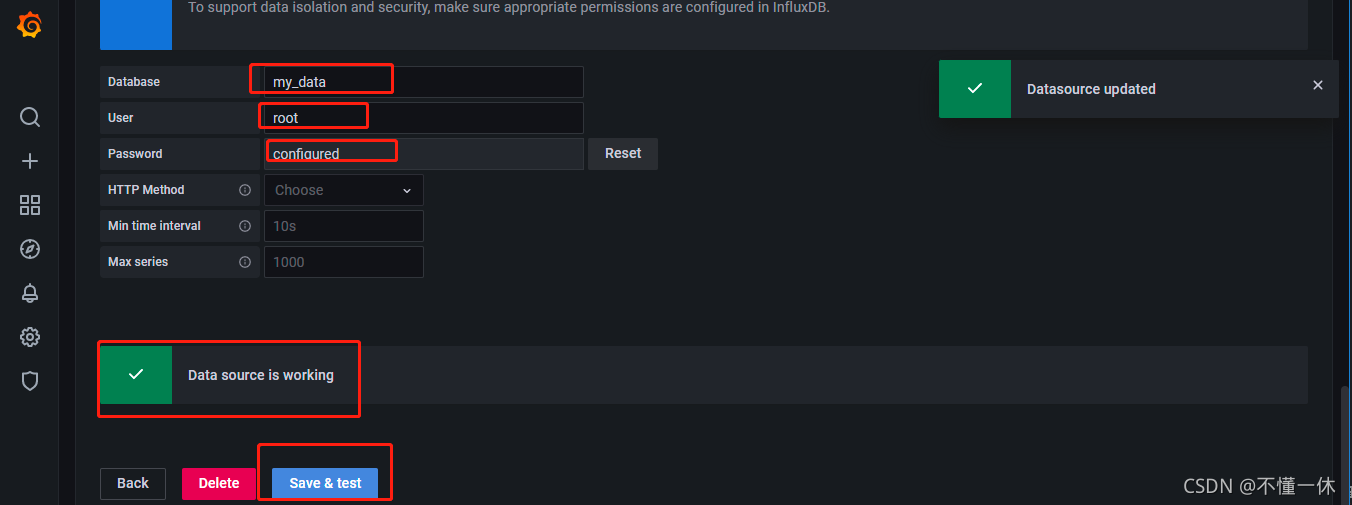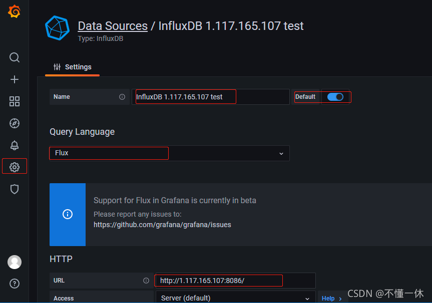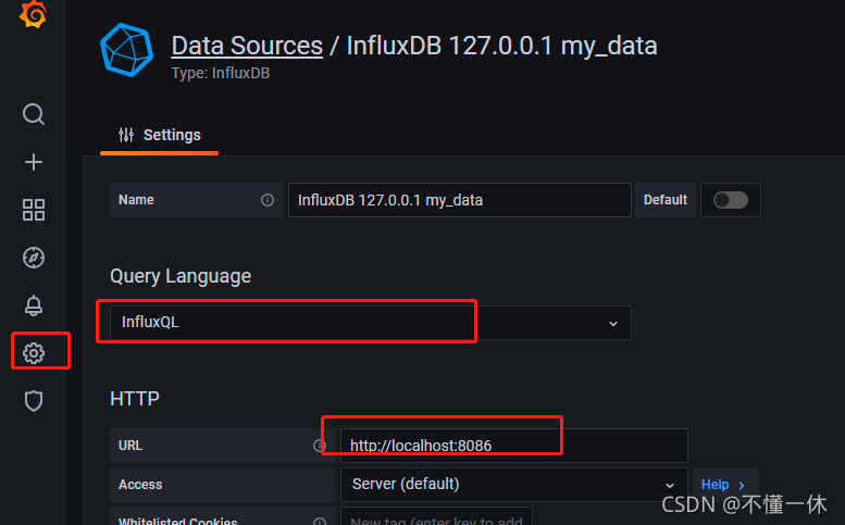 grafana 连接 influx 1.x ,点击设置里面的 datasources ,名字自己制定,查询语言需要选择 influxQL,设置链接地址 URL