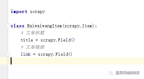 创建 Item 需要继承 scrapy.Item 类,并且定义类型为 scrapy.Field 的字段
