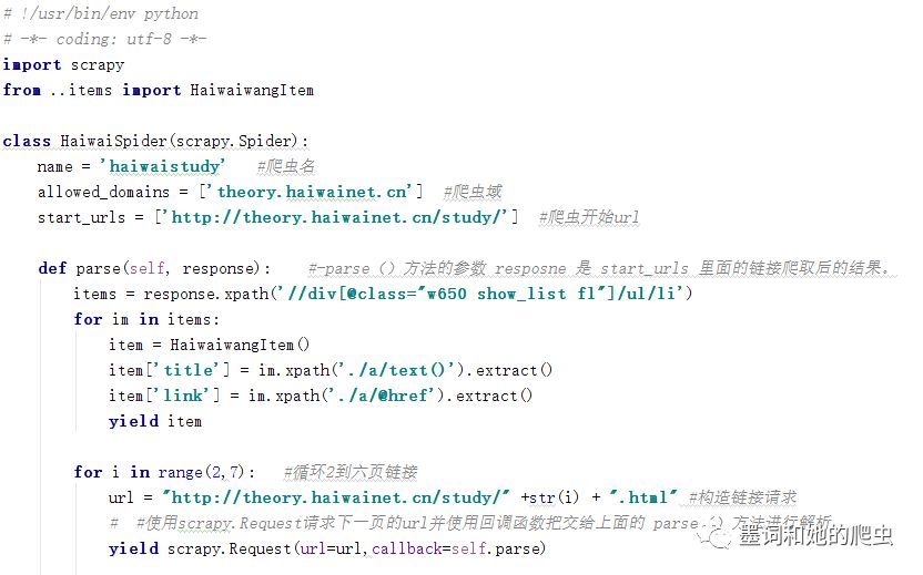 2:编写爬虫文件haiwaistudy.py,定义了爬取范围,爬取内容,是否有下一页循环等信息