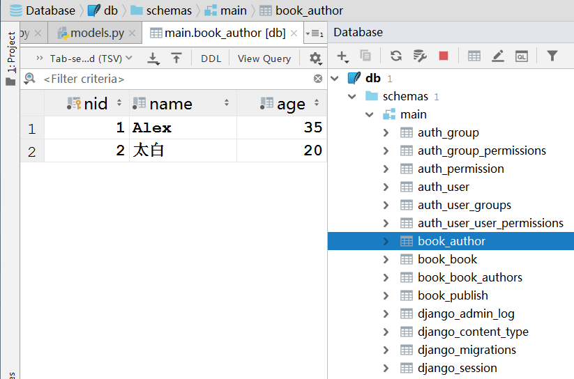from django.db import models # Create your models here. class Author(models.Model): nid = models.AutoField(primary_key=True) name = models.CharField(max_length=32) age = models.IntegerField() class Publish(models.Model): nid = models.AutoField(primary_key=True) name = models.CharField(max_length=32) city = models.CharField(max_length=32) email = models.EmailField() class Book(models.Model): nid = models.AutoField(primary_key=True) title = models.CharField(max_length=32) publishDate = models.DateField() price = models.DecimalField(max_digits=5, decimal_places=2) # 与Publish表建立一对多的关系,外键字段建立在多的一方 publish = models.ForeignKey(to="Publish", to_field="nid", on_delete=models.CASCADE) # 与Author表建立多对多的关系,ManyToManyField可以建在两个模型中的任意一个,自动创建第三张表 authors = models.ManyToManyField(to="Author",)