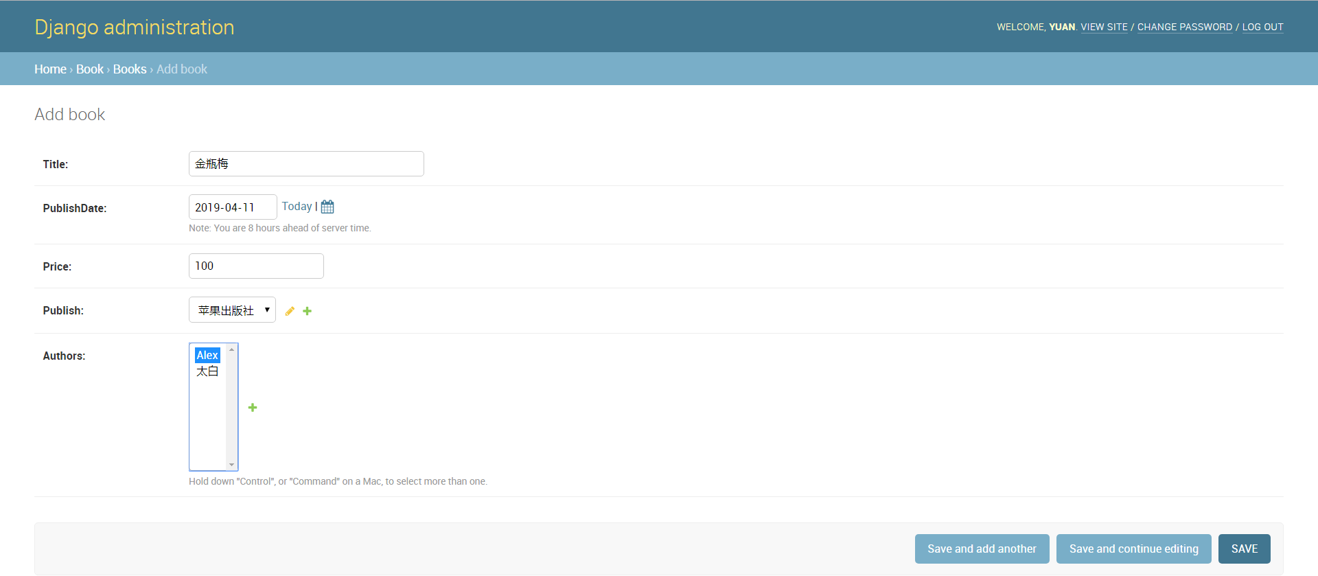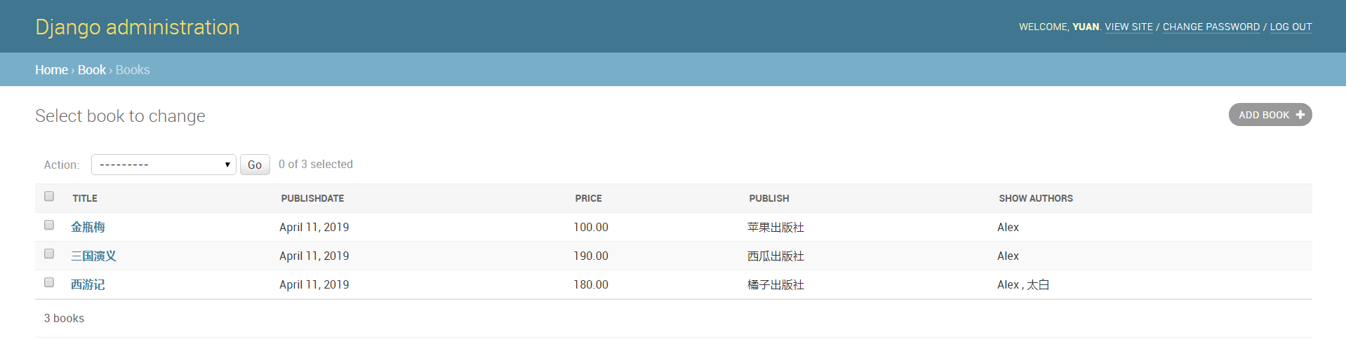 class BookConfig(admin.ModelAdmin): # 自定制显示列 def show_authors(self, obj): return " , ".join([obj.name for obj in obj.authors.all()]) list_display = ["title", "publishDate", "price", "publish", "show_authors", "state"]