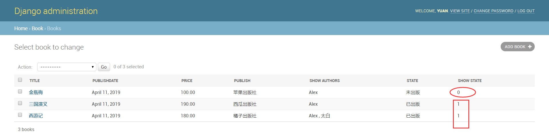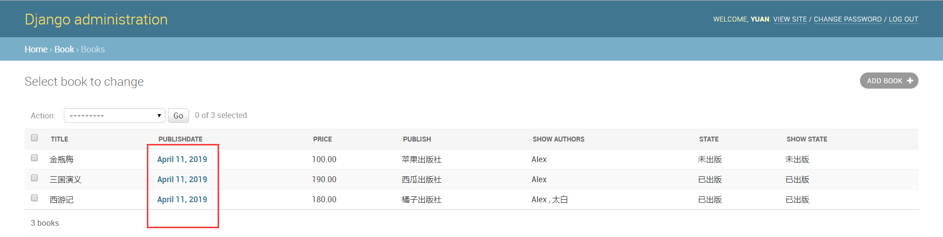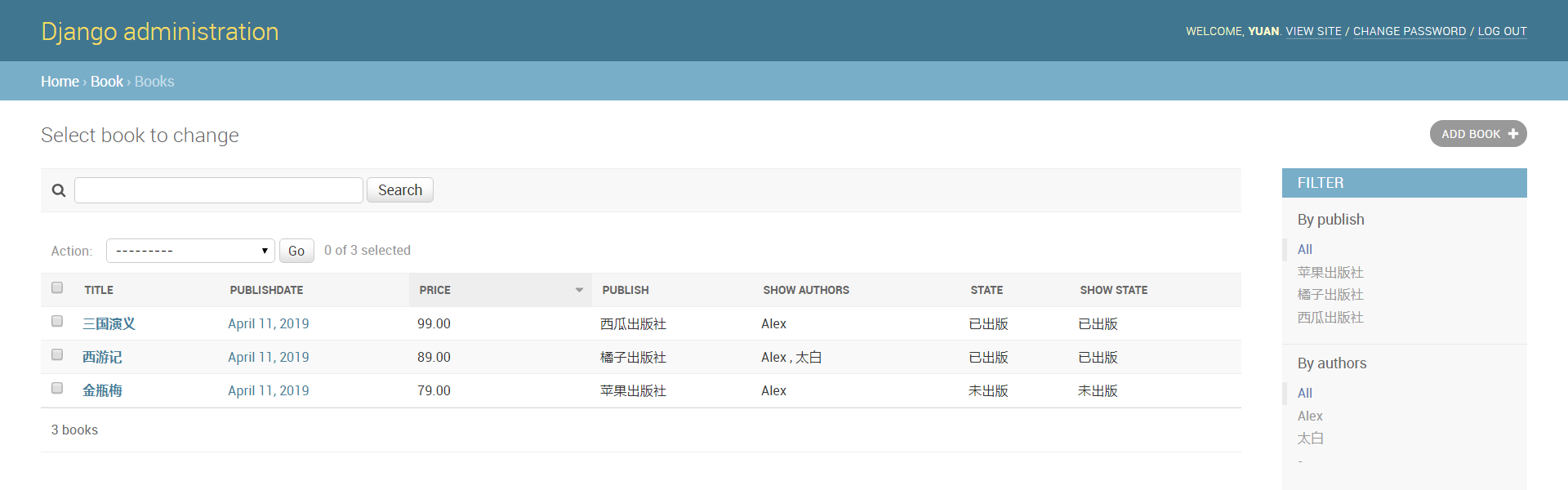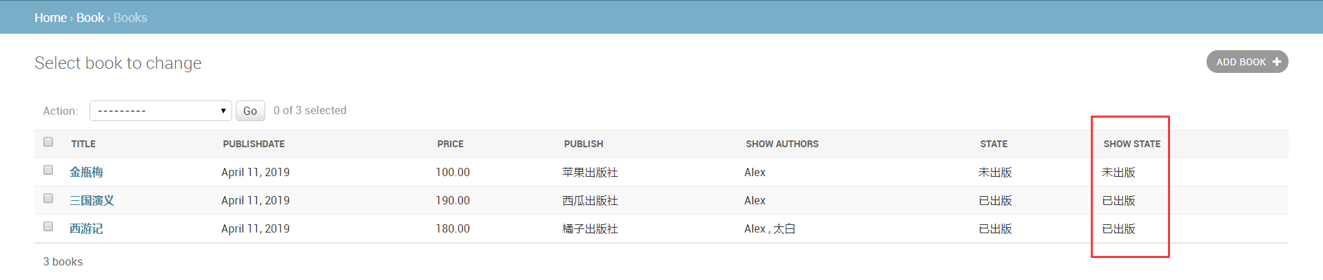 class BookConfig(admin.ModelAdmin): # 自定制显示列 def show_authors(self, obj): return " , ".join([obj.name for obj in obj.authors.all()]) def show_state(self, obj): # return obj.state return obj.get_state_display() list_display = ["title", "publishDate", "price", "publish", "show_authors", "state", "show_state"] list_display_links = ["publishDate",]
