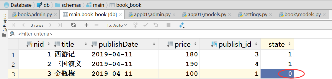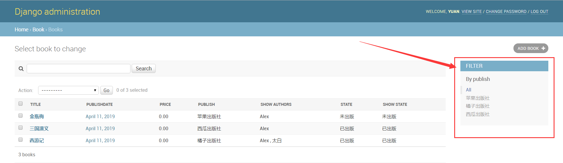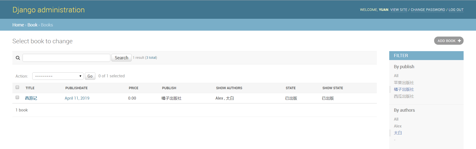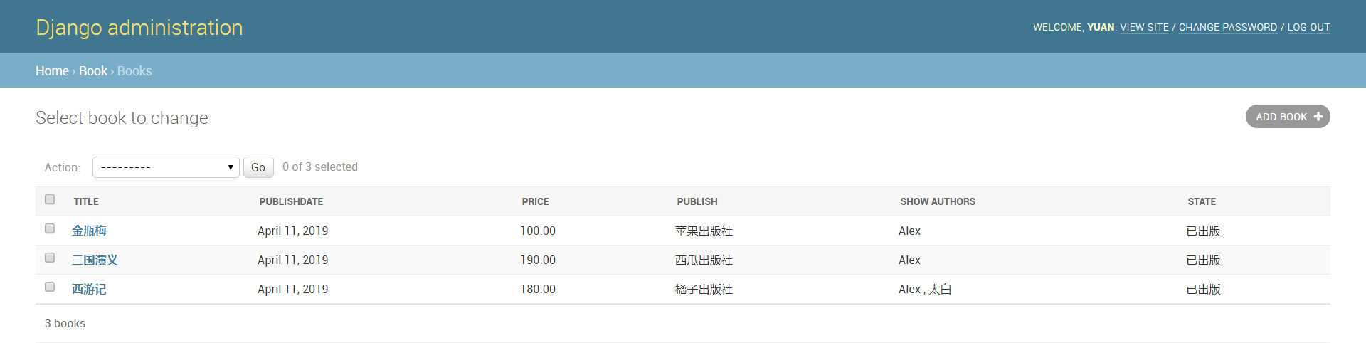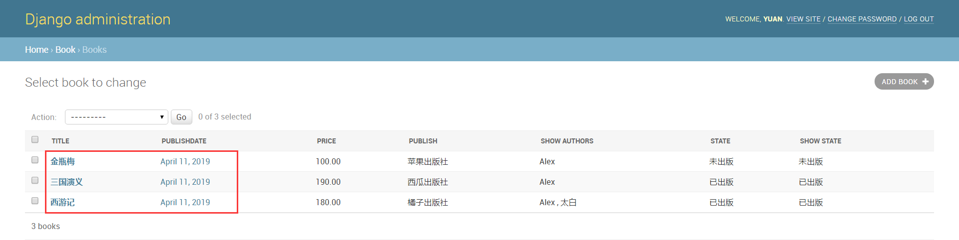 class BookConfig(admin.ModelAdmin): # 自定制显示列 def show_authors(self, obj): return " , ".join([obj.name for obj in obj.authors.all()]) def show_state(self, obj): # return obj.state return obj.get_state_display() list_display = ["title", "publishDate", "price", "publish", "show_authors", "state", "show_state"] list_display_links = ["publishDate",]