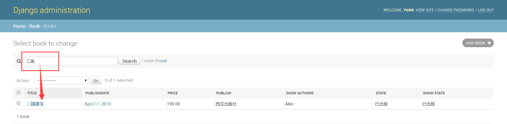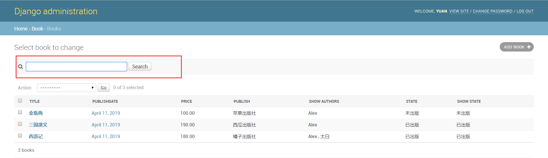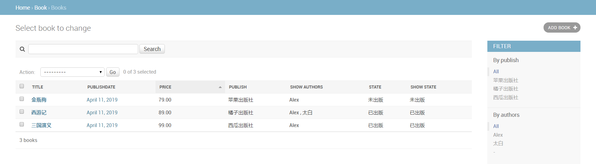 list_display = ["title", "publishDate", "price", "publish", "show_authors", "state", "show_state"] list_display_links = ["title", "publishDate"] search_fields = ["title"]