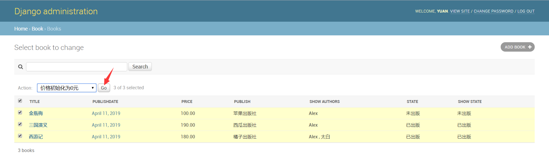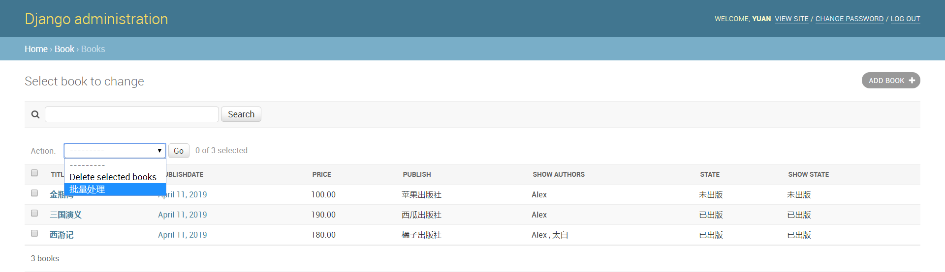 list_display = ["title", "publishDate", "price", "publish", "show_authors", "state", "show_state"] list_display_links = ["title", "publishDate"] search_fields = ["title"] # action操作 def patch_init(self, request, queryset): print("OK") patch_init.short_description = "批量处理" # 起个中文名字 actions = [patch_init]