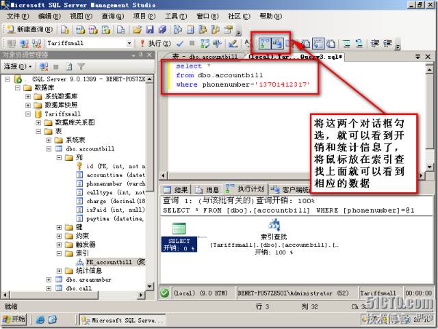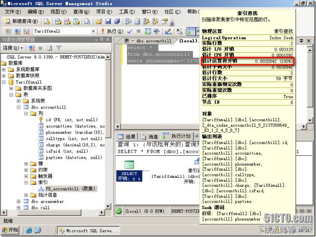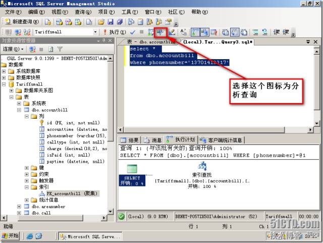 我们查询关于这个电话号码的所有信息,运算符开销为0.134137,这里就不截图了,将鼠标放在索引查找就可以看到。选中我们的查询语句,点击分析查询。