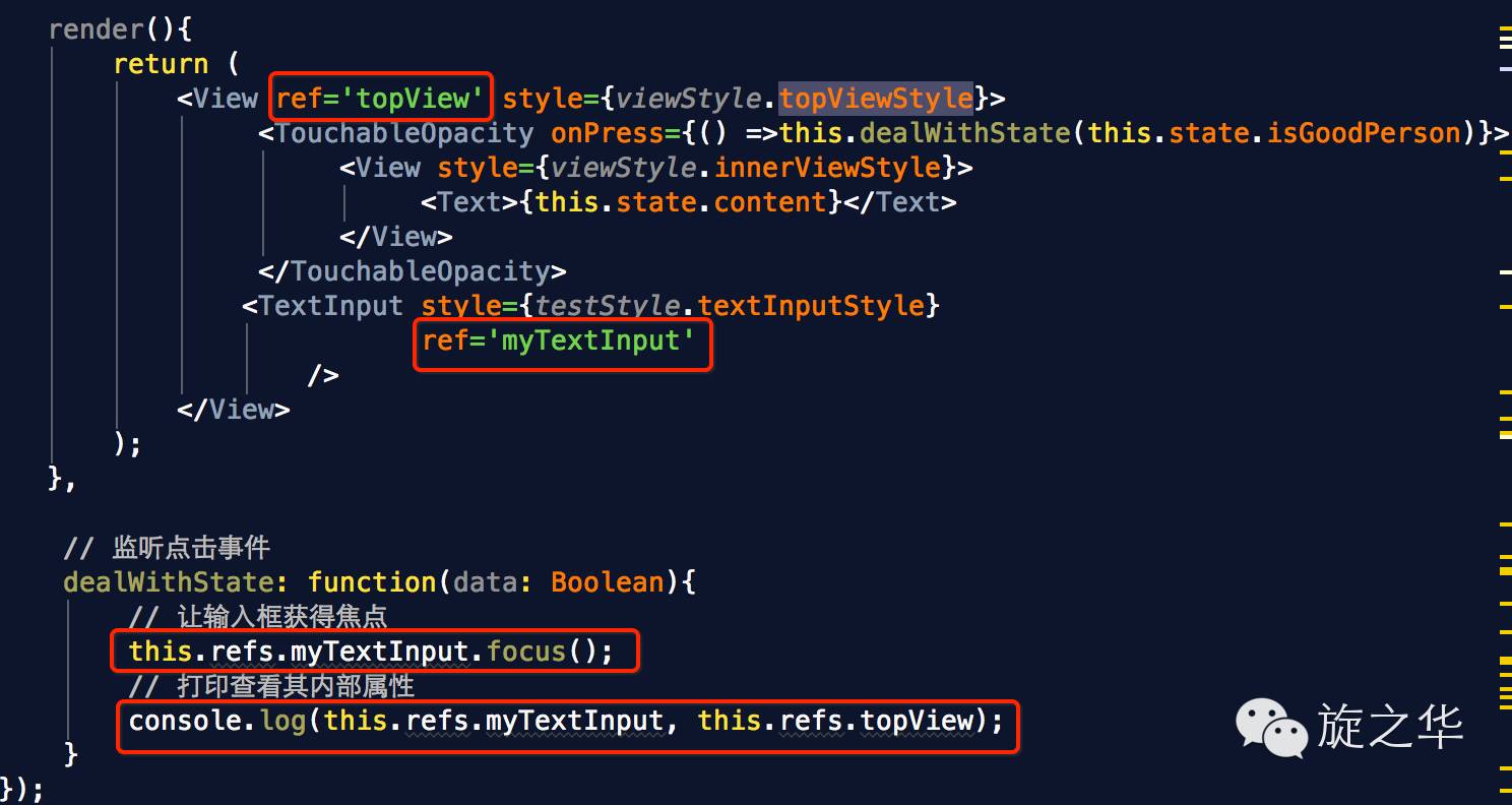 上面代码中,组件 View 的子节点有一个文本输入框,用于获取用户的输入。这时就必须获取真实的 DOM 节点,虚拟 DOM 是拿不到用户输入的。为了做到这一点,文本输入框必须有一个 ref属性,然后 this.refs.[refName] 就会返回这个真实的 DOM 节点。