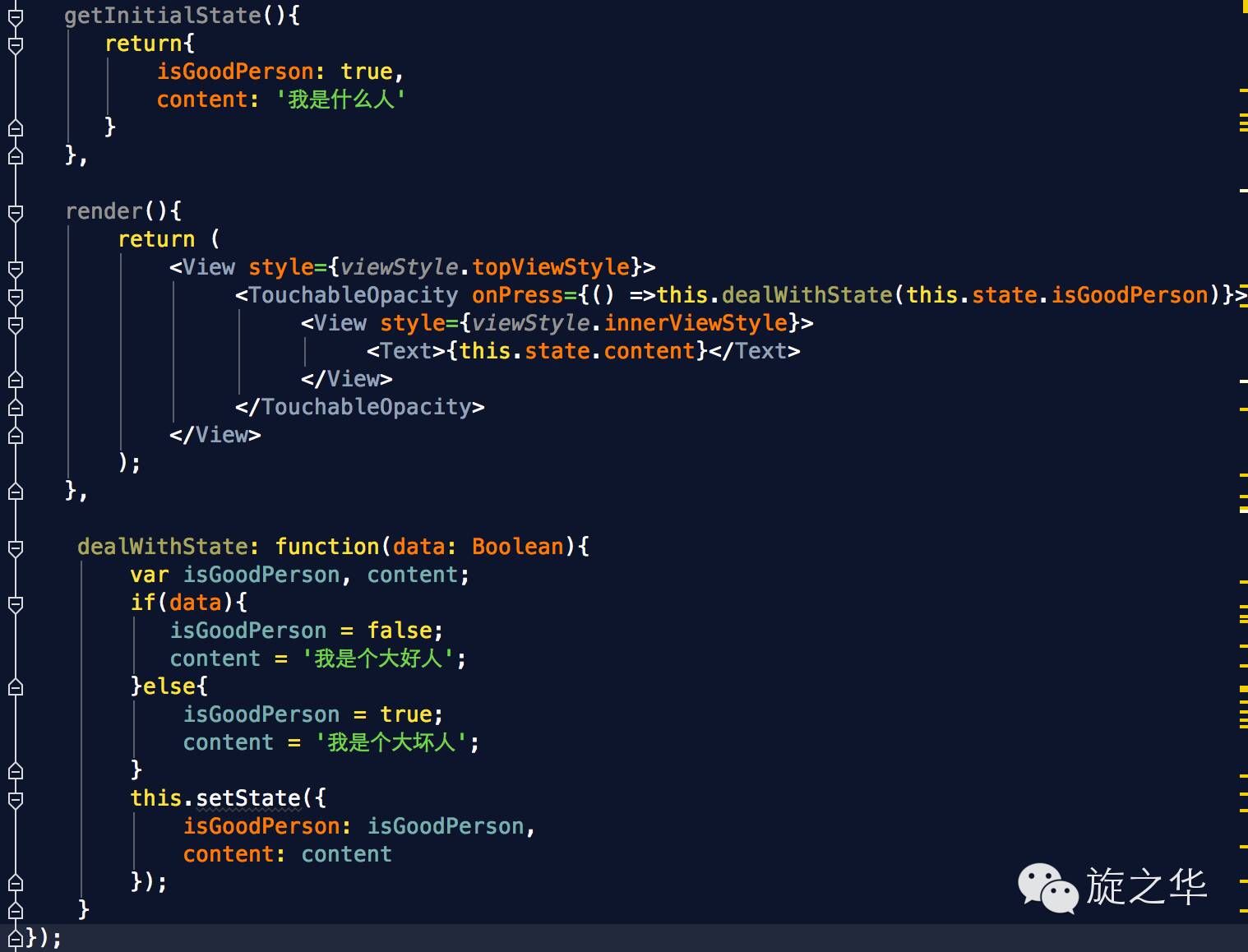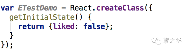 由于该函数不同于getDefaultProps,在以后的过程中,会再次调用,所以可以将控制控件的状态的一些变量放在这里初始化,如控件上显示的文字,可以通过this.state来获取值,通过this.setState来修改state值, 比如: