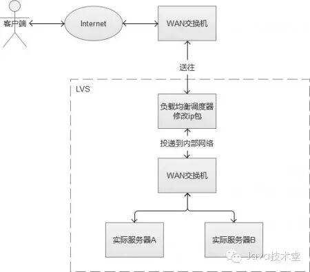 上述的方式叫LVS-NAT,除此之外,还有LVS-RD(直接路由),LVS-TUN(IP隧道),三者之间都属于LVS的方式,但是有一定的区别,篇幅问题,不赘叙。