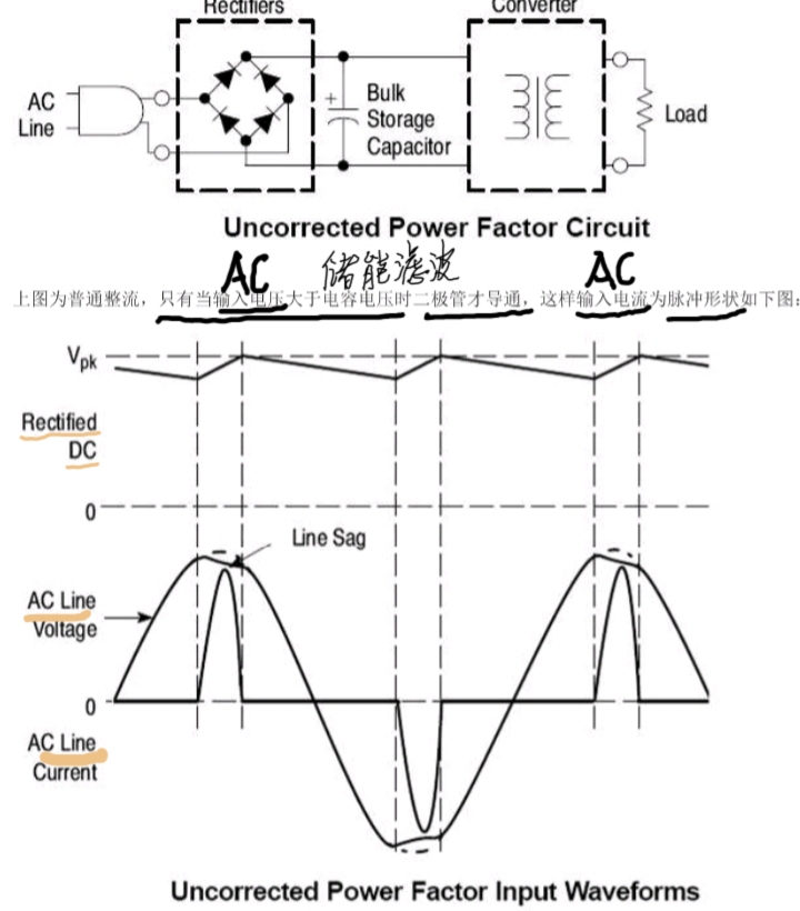 是因为\(\large \text{SP} 大多数都用 \text{ 整流电路 + 大电容滤波 的容性负载电路结构 }\)PFC(Power Factor Correction, 功率因数校正)
