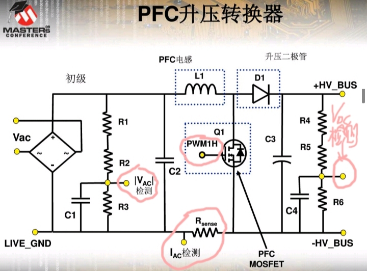 - DC实时电压信号采样: 在"PFC电感L 和 PFC大电容"滤波后的DC(高电压)处.