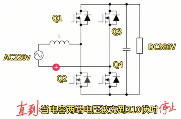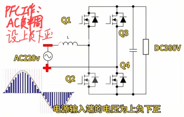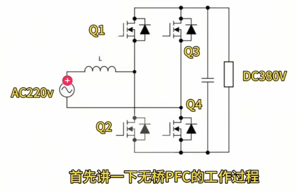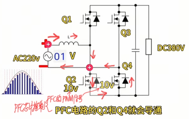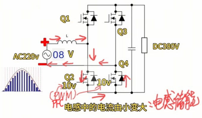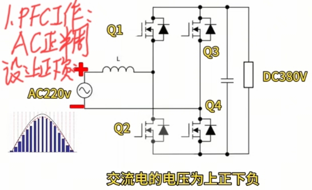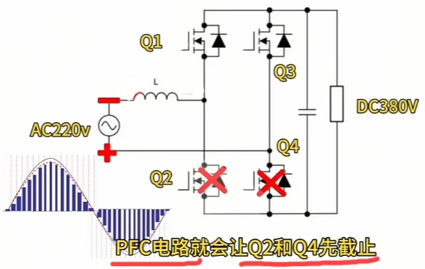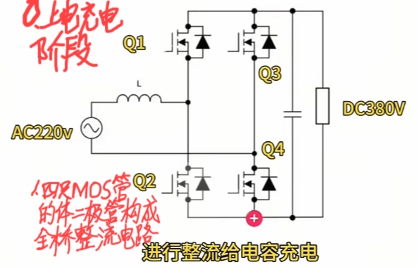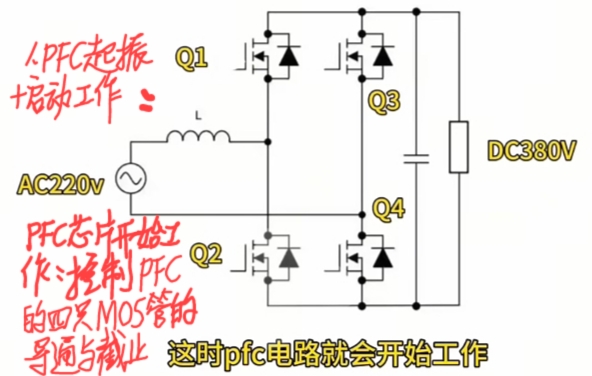 PFC四只MOS管的体二极管,构成全桥整流 为电容充电: