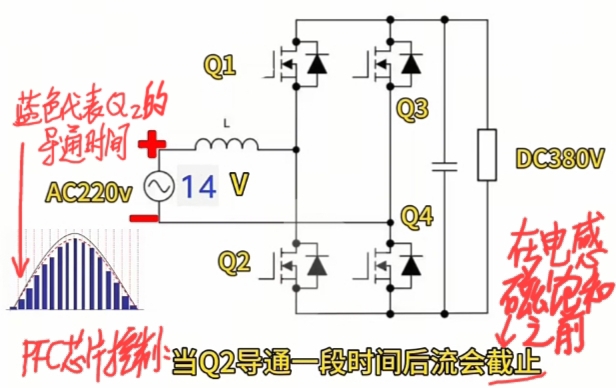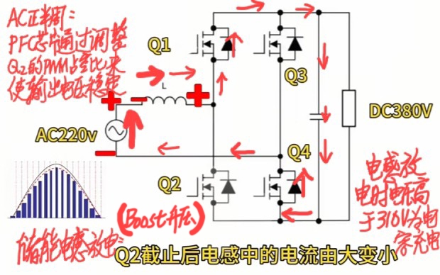 - Q4 在AC正半周期全程导通; Q2导通为L电感储能; Q2截止由L电感Boost电压为电容充电