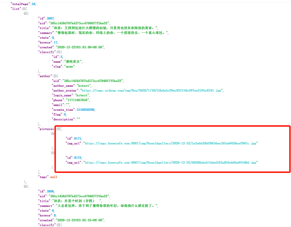 {"response":{"status":1,"message":"请求成功","data":{"page":1,"page_size":10,"totalPage":56,"list":[{"id":3807,"uid":"385c1458d707bd373cc47048f7f5be22","title":"林若:又回到这座灯火阑珊的旧城,只是再也没有你陪我的黄昏。","summary":"情绪低落时,现实的你,网络上的你,一个假装快乐,一个真心难过。","state":0,"browse":17,"created":"2020-12-22T03:03:08+08:00","classify":{"id":2,"name":"清纯美女","slug":"qcmn"},"author":{"uid":"385c1458d707bd373cc47048f7f5be22","author_name":"kstest","author_avatar":"https://imgs.aideep.com/img/0xu/2020/7/30/53bda5c29ec82f150c297ae2193c8191.jpg","login_name":"kstest","phone":"17711067850","email":"","create_time":1516856296,"flag":0,"description":""},"pictures":[{"id":9171,"img_url":"https://imgs.knowsafe.com:8087/img/0xuoldgallery/2020-12-22/1a2ebb29df8634ea18fab0438aef067c.jpg"},{"id":9172,"img_url":"https://imgs.knowsafe.com:8087/img/0xuoldgallery/2020-12-22/48260abe57dabd163a824eb0de8f540d.jpg"}],"tags":null},{"id":3806,"uid":"385c1458d707bd373cc47048f7f5be22","title":"林若:在某个时刻(存照) ","summary":"人总是这样,终于到了懂得珍惜的年纪,却偏偏什么都走散了。","state":0,"browse":9,"created":"2020-12-22T03:02:23+08:00","classify":{"id":2,"name":"清纯美女","slug":"qcmn"},"author":{"uid":"385c1458d707bd373cc47048f7f5be22","author_name":"kstest","author_avatar":"https://imgs.aideep.com/img/0xu/2020/7/30/53bda5c29ec82f150c297ae2193c8191.jpg","login_name":"kstest","phone":"17711067850","email":"","create_time":1516856296,"flag":0,"description":""},"pictures":[{"id":9170,"img_url":"https://imgs.knowsafe.com:8087/img/0xuoldgallery/2020-12-22/182ea3276e49c000284f914dfe5ee4de.jpg"}],"tags":null},{"id":3805,"uid":"385c1458d707bd373cc47048f7f5be22","title":"林若:他知道你舍不得离开才肆无忌惮的伤害。","summary":"这一生,这一世,因为不再有你,所以爱情轰然老去。","state":0,"browse":5,"created":"2020-12-22T03:01:50+08:00","classify":{"id":2,"name":"清纯美女","slug":"qcmn"},"author":{"uid":"385c1458d707bd373cc47048f7f5be22","author_name":"kstest","author_avatar":"https://imgs.aideep.com/img/0xu/2020/7/30/53bda5c29ec82f150c297ae2193c8191.jpg","login_name":"kstest","phone":"17711067850","email":"","create_time":1516856296,"flag":0,"description":""},"pictures":[{"id":9169,"img_url":"https://imgs.knowsafe.com:8087/img/0xuoldgallery/2020-12-22/09b79f16080a773eb25b207c76c2eca6.jpg"}],"tags":null},{"id":3804,"uid":"385c1458d707bd373cc47048f7f5be22","title":"林若Abby:年头觉得自己还蛮好看的 年尾怎么就长残了","summary":"一个人躲在角落里,悄悄的落泪,因为没有人值得我倾诉。","state":0,"browse":6,"created":"2020-12-22T03:01:22+08:00","classify":{"id":2,"name":"清纯美女","slug":"qcmn"},"author":{"uid":"385c1458d707bd373cc47048f7f5be22","author_name":"kstest","author_avatar":"https://imgs.aideep.com/img/0xu/2020/7/30/53bda5c29ec82f150c297ae2193c8191.jpg","login_name":"kstest","phone":"17711067850","email":"","create_time":1516856296,"flag":0,"description":""},"pictures":[{"id":9168,"img_url":"https://imgs.knowsafe.com:8087/img/0xuoldgallery/2020-12-22/8e190cb74b4b0f0ba526935b17aee9d8.jpg"}],"tags":null},{"id":3803,"uid":"385c1458d707bd373cc47048f7f5be22","title":"林若:怀念半年前傻傻憨憨 快快乐乐的自己 ","summary":"有裂痕的愛怎麽重蓋、悲傷要怎麽平靜純白。","state":0,"browse":7,"created":"2020-12-22T03:00:07+08:00","classify":{"id":2,"name":"清纯美女","slug":"qcmn"},"author":{"uid":"385c1458d707bd373cc47048f7f5be22","author_name":"kstest","author_avatar":"https://imgs.aideep.com/img/0xu/2020/7/30/53bda5c29ec82f150c297ae2193c8191.jpg","login_name":"kstest","phone":"17711067850","email":"","create_time":1516856296,"flag":0,"description":""},"pictures":[{"id":9167,"img_url":"https://imgs.knowsafe.com:8087/img/0xuoldgallery/2020-12-22/91b162607c9d204916f3d0d803ffcb75.jpg"}],"tags":null},{"id":3800,"uid":"385c1458d707bd373cc47048f7f5be22","title":"杏子大人:情书也撕了,酒杯也碎了,别担心,你走吧,我不爱你了","summary":"很多事情没有来日方长,很多人都只会乍然离场。一组伤感的个性签名送给你们,希望伤心难过时能带给你一丝慰藉。","state":0,"browse":7,"created":"2020-12-22T02:57:09+08:00","classify":{"id":2,"name":"清纯美女","slug":"qcmn"},"author":{"uid":"385c1458d707bd373cc47048f7f5be22","author_name":"kstest","author_avatar":"https://imgs.aideep.com/img/0xu/2020/7/30/53bda5c29ec82f150c297ae2193c8191.jpg","login_name":"kstest","phone":"17711067850","email":"","create_time":1516856296,"flag":0,"description":""},"pictures":[{"id":9164,"img_url":"https://imgs.knowsafe.com:8087/img/0xuoldgallery/2020-12-22/b7ef615e0c03c602095d0092d370ba5c.jpg"}],"tags":null},{"id":3799,"uid":"385c1458d707bd373cc47048f7f5be22","title":"杏子大人:微笑就像创可贴,掩饰了伤口,痛还在。","summary":"你的名字,写下来不过几厘米那么短,却贯穿了我那么长的时光。","state":0,"browse":9,"created":"2020-12-22T02:56:24+08:00","classify":{"id":2,"name":"清纯美女","slug":"qcmn"},"author":{"uid":"385c1458d707bd373cc47048f7f5be22","author_name":"kstest","author_avatar":"https://imgs.aideep.com/img/0xu/2020/7/30/53bda5c29ec82f150c297ae2193c8191.jpg","login_name":"kstest","phone":"17711067850","email":"","create_time":1516856296,"flag":0,"description":""},"pictures":[{"id":9162,"img_url":"https://imgs.knowsafe.com:8087/img/0xuoldgallery/2020-12-22/7a04b64835cdb0e8a666caec25bb64d3.jpg"},{"id":9163,"img_url":"https://imgs.knowsafe.com:8087/img/0xuoldgallery/2020-12-22/74af547d45e9e329497cd10272608686.jpg"}],"tags":null},{"id":3793,"uid":"385c1458d707bd373cc47048f7f5be22","title":"杏子大人:更可笑的是我瞒着所有人继续爱了你好久。","summary":"当身边结婚的朋友越来越多,当朋友圈晒娃的越来越多,有时候想想,大概是等不到你了。","state":0,"browse":2,"created":"2020-