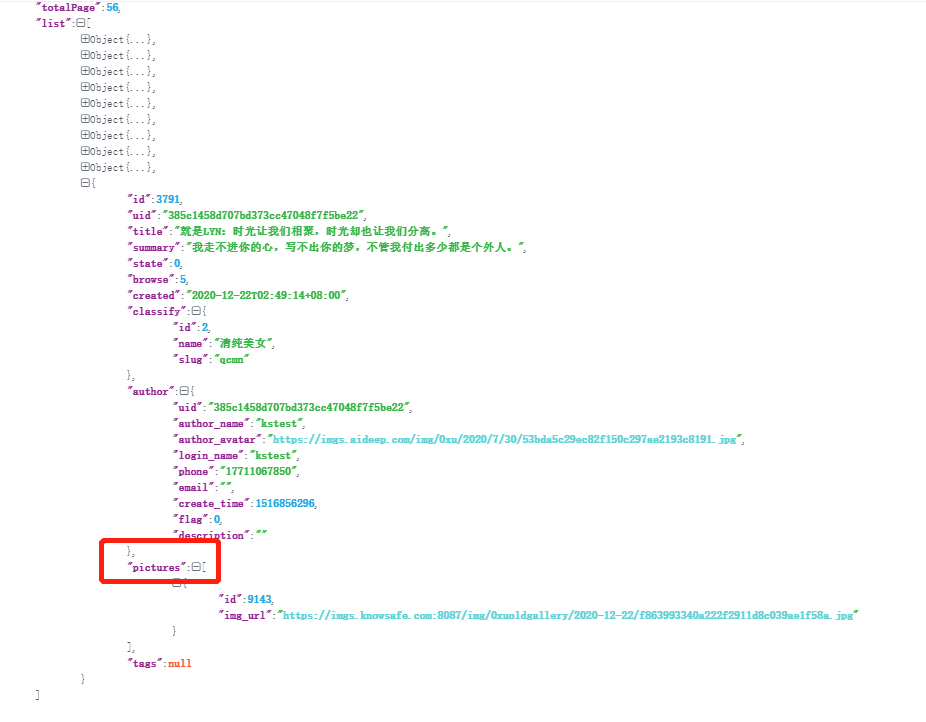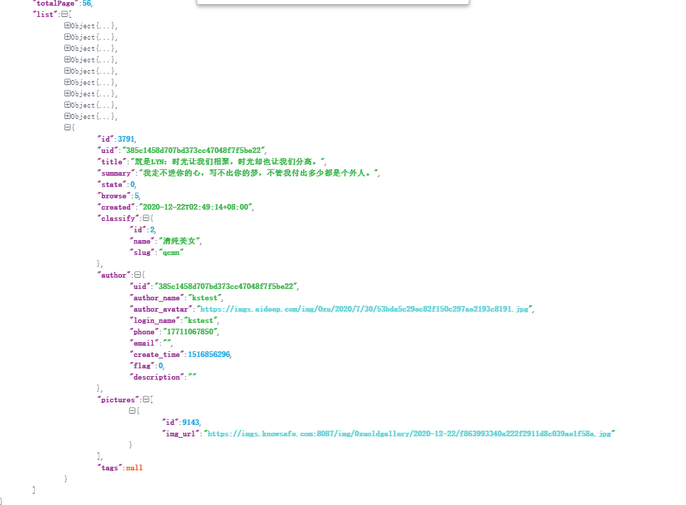 {'page': 1, 'page_size': 10, 'totalPage': 56, 'list': [{'id': 3807, 'uid': '385c1458d707bd373cc47048f7f5be22', 'title': '林若:又回到这座灯火阑珊的旧城,只是再也没有你陪我的黄昏。', 'summary': '情绪低落时,现实的你,网络上的你,一个假装快乐,一个真心难过。', 'state': 0, 'browse': 17, 'created': '2020-12-22T03:03:08+08:00', 'classify': {'id': 2, 'name': '清纯美女', 'slug': 'qcmn'}, 'author': {'uid': '385c1458d707bd373cc47048f7f5be22', 'author_name': 'kstest', 'author_avatar': 'https://imgs.aideep.com/img/0xu/2020/7/30/53bda5c29ec82f150c297ae2193c8191.jpg', 'login_name': 'kstest', 'phone': '17711067850', 'email': '', 'create_time': 1516856296, 'flag': 0, 'description': ''}, 'pictures': [{'id': 9171, 'img_url': 'https://imgs.knowsafe.com:8087/img/0xuoldgallery/2020-12-22/1a2ebb29df8634ea18fab0438aef067c.jpg'}, {'id': 9172, 'img_url': 'https://imgs.knowsafe.com:8087/img/0xuoldgallery/2020-12-22/48260abe57dabd163a824eb0de8f540d.jpg'}], 'tags': None}, {'id': 3806, 'uid': '385c1458d707bd373cc47048f7f5be22', 'title': '林若:在某个时刻(存照) \u200b\u200b\u200b\u200b', 'summary': '人总是这样,终于到了懂得珍惜的年纪,却偏偏什么都走散了。', 'state': 0, 'browse': 9, 'created': '2020-12-22T03:02:23+08:00', 'classify': {'id': 2, 'name': '清纯美女', 'slug': 'qcmn'}, 'author': {'uid': '385c1458d707bd373cc47048f7f5be22', 'author_name': 'kstest', 'author_avatar': 'https://imgs.aideep.com/img/0xu/2020/7/30/53bda5c29ec82f150c297ae2193c8191.jpg', 'login_name': 'kstest', 'phone': '17711067850', 'email': '', 'create_time': 1516856296, 'flag': 0, 'description': ''}, 'pictures': [{'id': 9170, 'img_url': 'https://imgs.knowsafe.com:8087/img/0xuoldgallery/2020-12-22/182ea3276e49c000284f914dfe5ee4de.jpg'}], 'tags': None}, {'id': 3805, 'uid': '385c1458d707bd373cc47048f7f5be22', 'title': '林若:他知道你舍不得离开才肆无忌惮的伤害。', 'summary': '这一生,这一世,因为不再有你,所以爱情轰然老去。', 'state': 0, 'browse': 5, 'created': '2020-12-22T03:01:50+08:00', 'classify': {'id': 2, 'name': '清纯美女', 'slug': 'qcmn'}, 'author': {'uid': '385c1458d707bd373cc47048f7f5be22', 'author_name': 'kstest', 'author_avatar': 'https://imgs.aideep.com/img/0xu/2020/7/30/53bda5c29ec82f150c297ae2193c8191.jpg', 'login_name': 'kstest', 'phone': '17711067850', 'email': '', 'create_time': 1516856296, 'flag': 0, 'description': ''}, 'pictures': [{'id': 9169, 'img_url': 'https://imgs.knowsafe.com:8087/img/0xuoldgallery/2020-12-22/09b79f16080a773eb25b207c76c2eca6.jpg'}], 'tags': None}, {'id': 3804, 'uid': '385c1458d707bd373cc47048f7f5be22', 'title': '林若Abby:年头觉得自己还蛮好看的 年尾怎么就长残了', 'summary': '一个人躲在角落里,悄悄的落泪,因为没有人值得我倾诉。', 'state': 0, 'browse': 6, 'created': '2020-12-22T03:01:22+08:00', 'classify': {'id': 2, 'name': '清纯美女', 'slug': 'qcmn'}, 'author': {'uid': '385c1458d707bd373cc47048f7f5be22', 'author_name': 'kstest', 'author_avatar': 'https://imgs.aideep.com/img/0xu/2020/7/30/53bda5c29ec82f150c297ae2193c8191.jpg', 'login_name': 'kstest', 'phone': '17711067850', 'email': '', 'create_time': 1516856296, 'flag': 0, 'description': ''}, 'pictures': [{'id': 9168, 'img_url': 'https://imgs.knowsafe.com:8087/img/0xuoldgallery/2020-12-22/8e190cb74b4b0f0ba526935b17aee9d8.jpg'}], 'tags': None}, {'id': 3803, 'uid': '385c1458d707bd373cc47048f7f5be22', 'title': '林若:怀念半年前傻傻憨憨 快快乐乐的自己 \u200b\u200b\u200b\u200b', 'summary': '有裂痕的愛怎麽重蓋、悲傷要怎麽平靜純白。', 'state': 0, 'browse': 7, 'created': '2020-12-22T03:00:07+08:00', 'classify': {'id': 2, 'name': '清纯美女', 'slug': 'qcmn'}, 'author': {'uid': '385c1458d707bd373cc47048f7f5be22', 'author_name': 'kstest', 'author_avatar': 'https://imgs.aideep.com/img/0xu/2020/7/30/53bda5c29ec82f150c297ae2193c8191.jpg', 'login_name': 'kstest', 'phone': '17711067850', 'email': '', 'create_time': 1516856296, 'flag': 0, 'description': ''}, 'pictures': [{'id': 9167, 'img_url': 'https://imgs.knowsafe.com:8087/img/0xuoldgallery/2020-12-22/91b162607c9d204916f3d0d803ffcb75.jpg'}], 'tags': None}, {'id': 3800, 'uid': '385c1458d707bd373cc47048f7f5be22', 'title': '杏子大人:情书也撕了,酒杯也碎了,别担心,你走吧,我不爱你了', 'summary': '很多事情没有来日方长,很多人都只会乍然离场。一组伤感的个性签名送给你们,希望伤心难过时能带给你一丝慰藉。', 'state': 0, 'browse': 7, 'created': '2020-12-22T02:57:09+08:00', 'classify': {'id': 2, 'name': '清纯美女', 'slug': 'qcmn'}, 'author': {'uid': '385c1458d707bd373cc47048f7f5be22', 'author_name': 'kstest', 'author_avatar': 'https://imgs.aideep.com/img/0xu/2020/7/30/53bda5c29ec82f150c297ae2193c8191.jpg', 'login_name': 'kstest', 'phone': '17711067850', 'email': '', 'create_time': 1516856296, 'flag': 0, 'description': ''}, 'pictures': [{'id': 9164, 'img_url': 'https://imgs.knowsafe.com:8087/img/0xuoldgallery/2020-12-22/b7ef615e0c03c602095d0092d370ba5c.jpg'}], 'tags': None}, {'id': 3799, 'uid': '385c1458d707bd373cc47048f7f5be22', 'title': '杏子大人:微笑就像创可贴,掩饰了伤口,痛还在。', 'summary': '你的名字,写下来不过几厘米那么短,却贯穿了我那么长的时光。', 'state': 0, 'browse': 9, 'created': '2020-12-22T02:56:24+08:00', 'classify': {'id': 2, 'name': '清纯美女', 'slug': 'qcmn'}, 'author': {'uid': '385c1458d707bd373cc47048f7f5be22', 'author_name': 'kstest', 'author_avatar': 'https://imgs.aideep.com/img/0xu/2020/7/30/53bda5c29ec82f150c297ae2193c8191.jpg', 'login_name': 'kstest', 'phone': '17711067850', 'email': '', 'create_time': 1516856296, 'flag': 0, 'description': ''}, 'pictures': [{'id': 9162, 'img_url': 'https://imgs.knowsafe.com:8087/img/0xuoldgallery/2020-12-22/7a04b64835cdb0e8a666caec25bb64d3.jpg'}, {'id': 9163, 'img_url': 'https://imgs.knowsafe.com:8087/img/0xuoldgallery/2020-12-22/74af547d45e9e3294