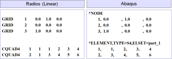 -例如:让我们对比在 OptiStruct 和 Abaqus 中,节点和单元的定义方式: