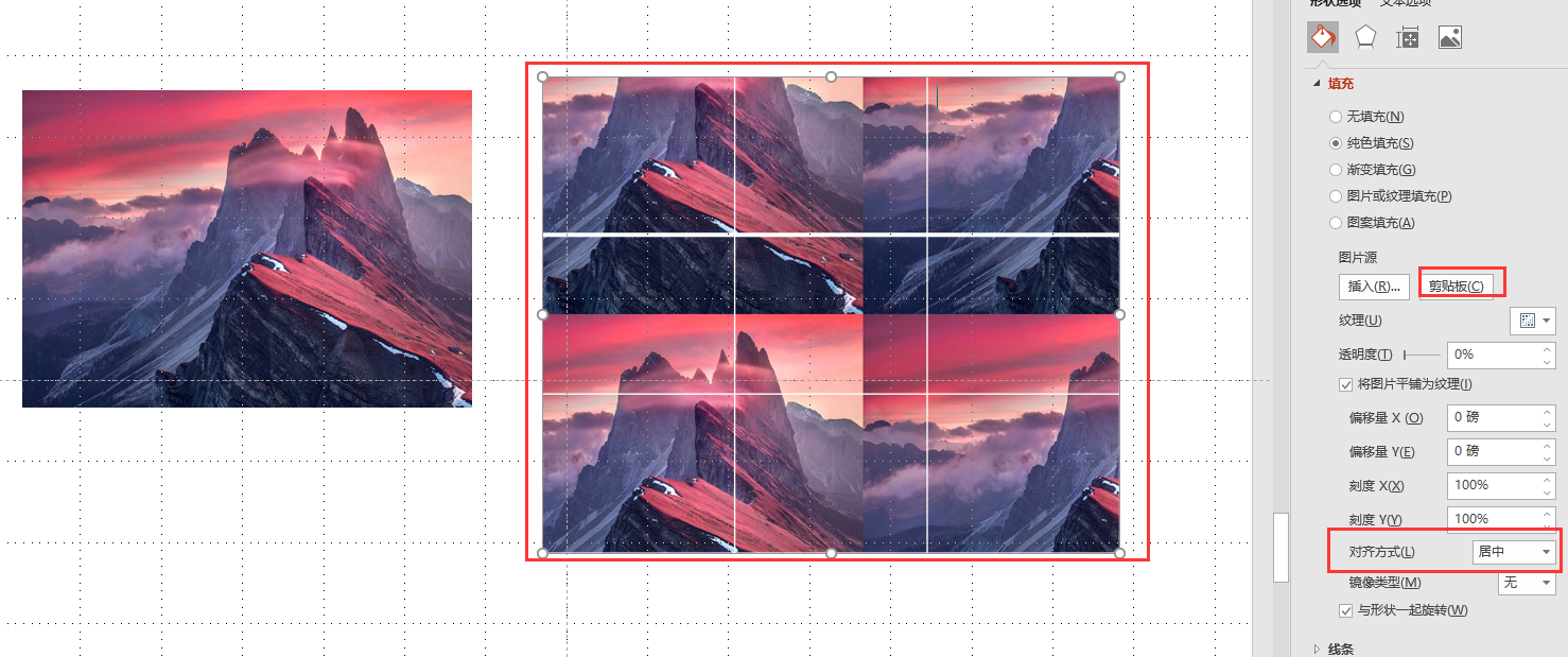 (3)全选中表格的所有单元格,然后点击右键-》设置形状格式-》填充-》图片或纹理填充,然后选择图片右键-》复制。然后再次选择表格的所有单元格-》设置形状格式-》填充-》图片源(来自剪贴板)-》将图片平铺为纹理-》对齐方式为居中对齐