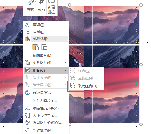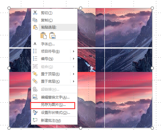 (4)然后将表格这张图片另存为emf为后缀的文件,然后重新插入,然后选择后进行取消组合-》再取消组合,之后这张大的图片就被表格拆分成9张单独的图片了。