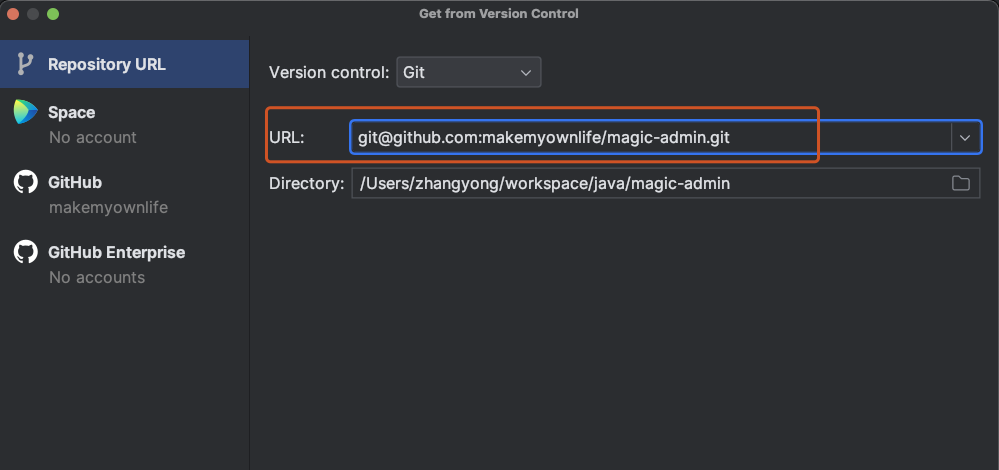 点击 Clone 后,URL 文本框填写项目的 HTTP 或 SSH 地址,比如 HTTP 的地址:git@github.com:makemyownlife/magic-admin.git,Directory 填写项目存储在本地的目录地址。