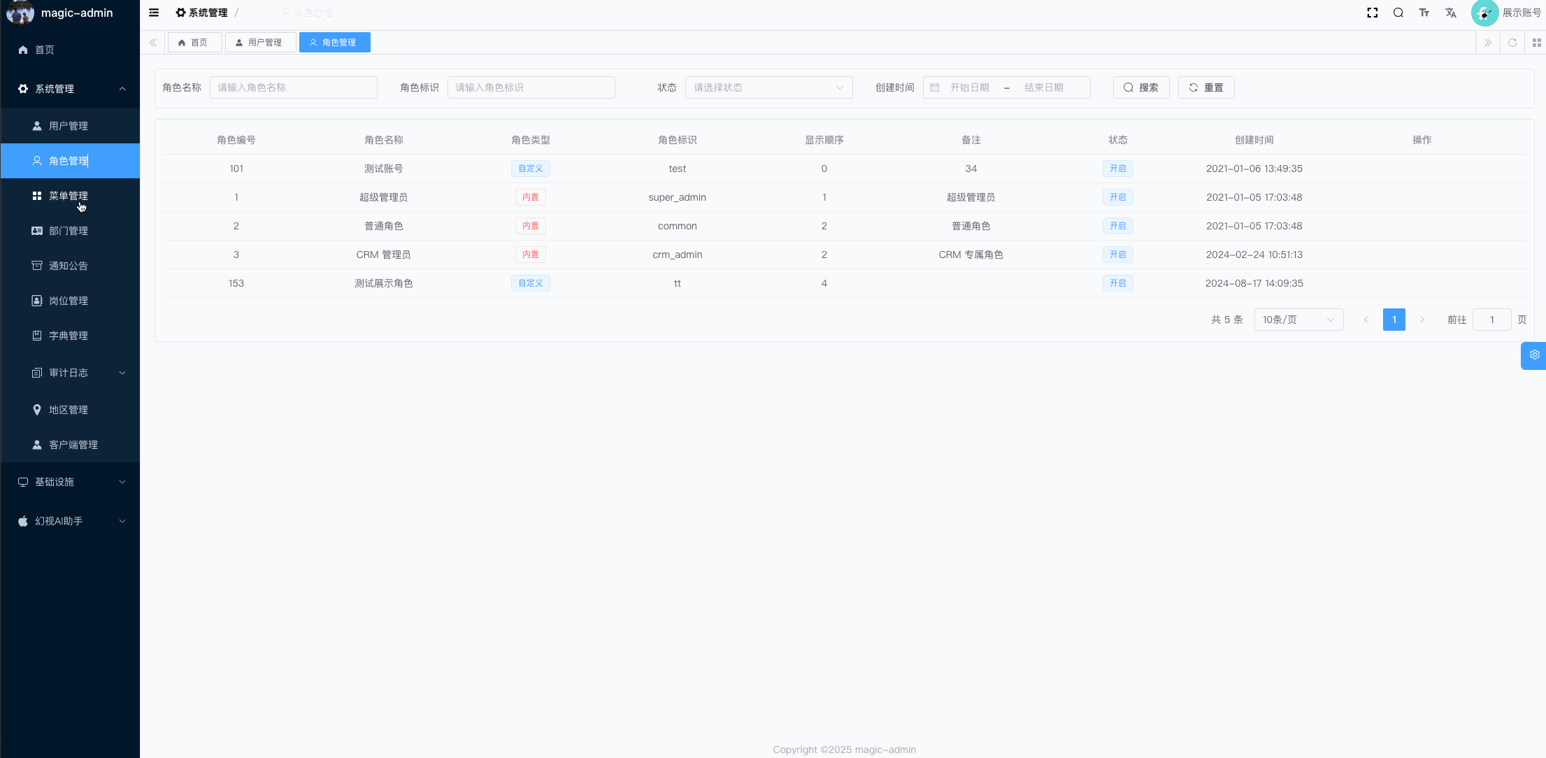 项目的名称:magic-admin , 保留了 RuoYi-Vue-Pro 的基础功能 ,同时在客户端管理、代码组织结构、 多租户管理这三个层面做了定制。