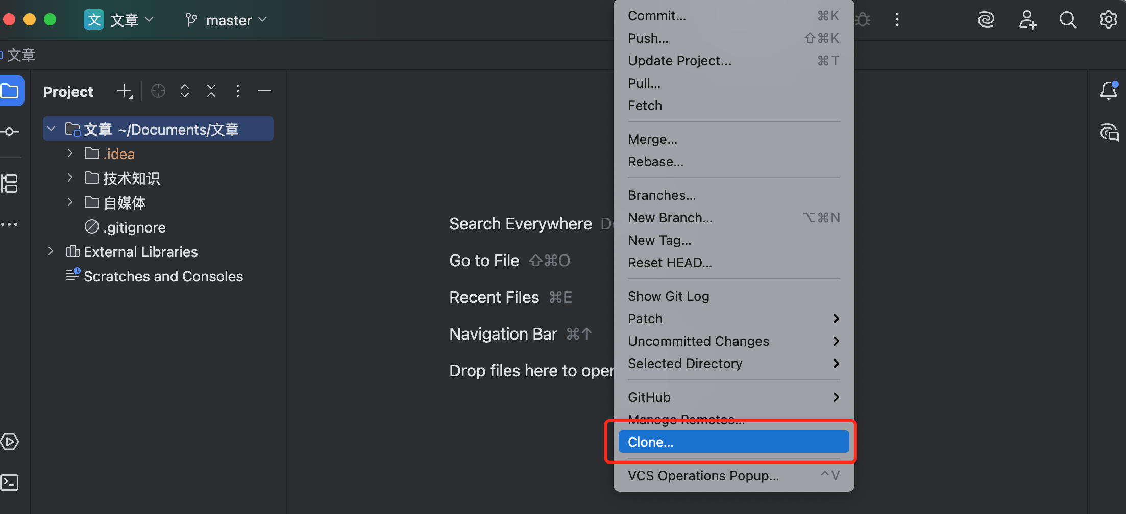 打开 IntelliJ IDEA,菜单栏顶部找到 Git -> Clone 选项。