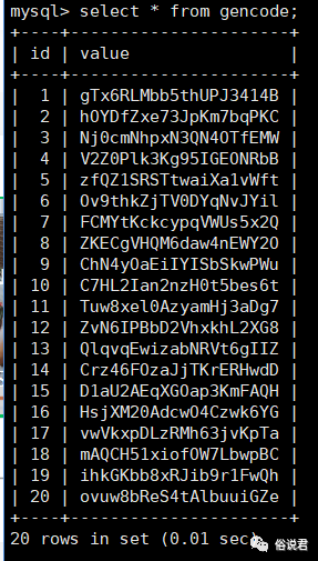 insert into gencode(id,value) values (1,'GB0XRF2boYF2BPEp46l5') #向表中插入数据,这里要注意数据的类型