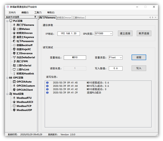 上述操作完成之后即完成了整个环境搭建的过程,下面使用喜科堂的通信测试平台软件进行通信测试,设置IP地址为192.168.1.20(根据实际情况修改),PLC类型选择S7-1500,点击连接,连接成功后,设置一个变量地址,这里注意的是,如果要读取DB存储区的地址,需要将DB块去除优化访问,对于M存储区则没要求,这里设置一个M区地址MD10,类型选择浮点型,点击读取,读取完成后,设置一个数值,点击写入之后,再读取,同时观察PLC中的数据,看看是否同步变化,如果同步变化,说明仿真环境搭建成功。