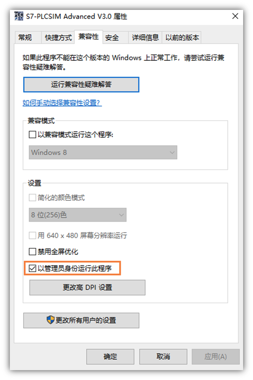 (1)软件要以管理员权限运行:可以直接每次右击,以管理员权限运行,如果想一劳永逸,可以点击图标,右击属性,在兼容性中,将以管理员身份运行此程序的选项勾选。