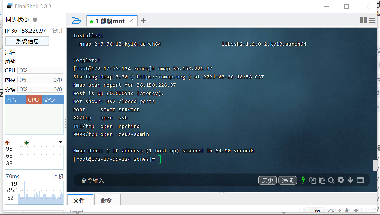 - 它的设计目标是快速地扫描大型网络,当然用它扫描单个主机也没有问题.Nmap以新颖的方式使用原始IP报文来发现网络上有一些主机,那些主机提供什么服务(应用程序名和版本),那些服务运行在什么操作系统(包括版本信息),它们使用什么类型的报文过滤器/防火墙,以及一堆其他功能。