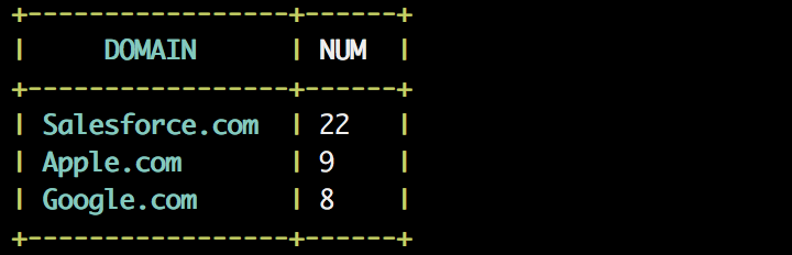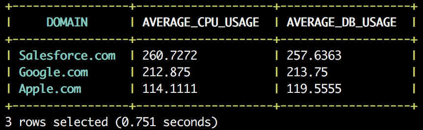 SELECT DOMAIN, AVG(CORE) Average_CPU_Usage, AVG(DB) Average_DB_Usage