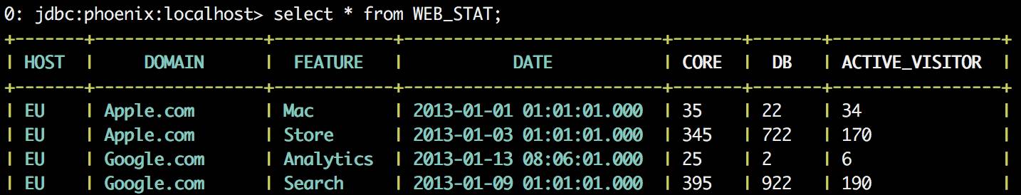 0: jdbc:phoenix:localhost> select * from WEB_STAT;