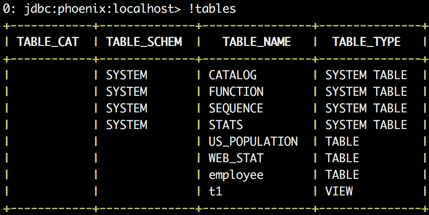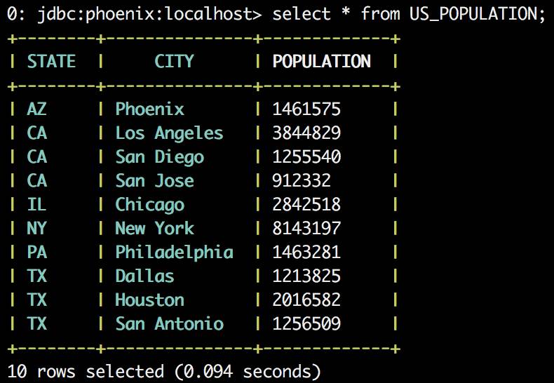 0: jdbc:phoenix:localhost> select * from US_POPULATION;