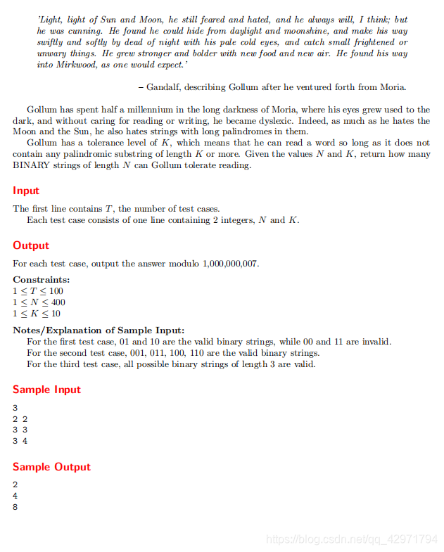 一个长的回文串都可以由短的回文串拓展而来,只要短的回文在左右两端增加相同的字符即可。因此,在考虑长度为NNN的01串时,只要在从长度为1向NNN拓展的过程中,保证后KKK个字符不是回文串即可。
