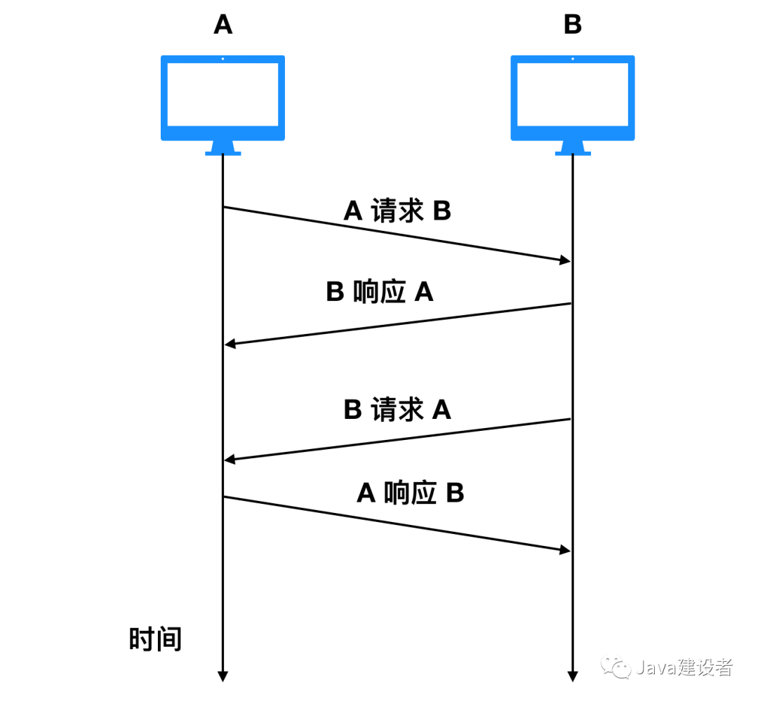 如图所示,A 和 B 是两个不同的端系统,它们之间可以作为信息交换的载体存在,刚开始的时候是 A 作为请求方请求与 B 交换信息,B 作为响应的一方提供信息;随着时间的推移,B 也可以作为请求方请求 A 交换信息,那么 A 也可以作为响应方响应 B 请求的信息。