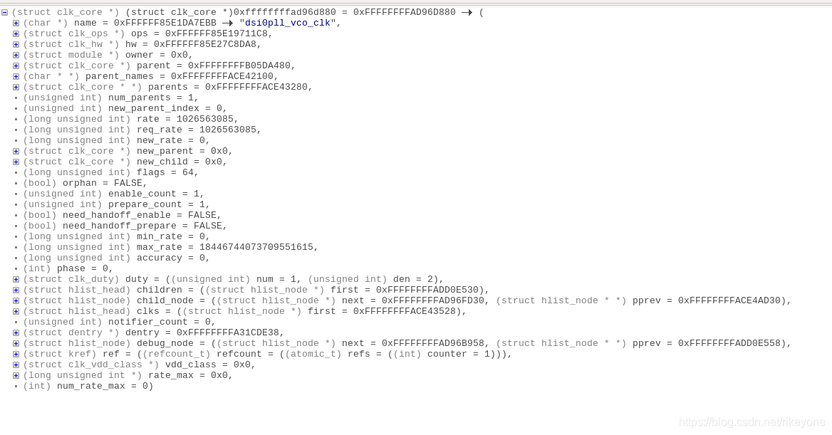 这个命令会以如下方式展示ffffffffad96d880地址上的结构体struct clk_core。这个使用方法还是比较常用的。