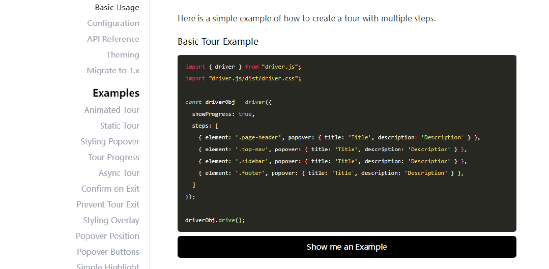 driver.js 除了上述的示例外,还支持很多配置能力,更多可以到官网查看示例。