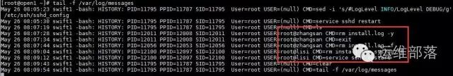 6、注销当前root用户,重新登陆后,查看/var/log/messages,如下就可以看到记录了操作命令