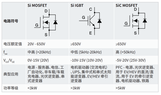 Si MOSFET、Si IGBT 和 SiC MOSFET 都用于电源应用,