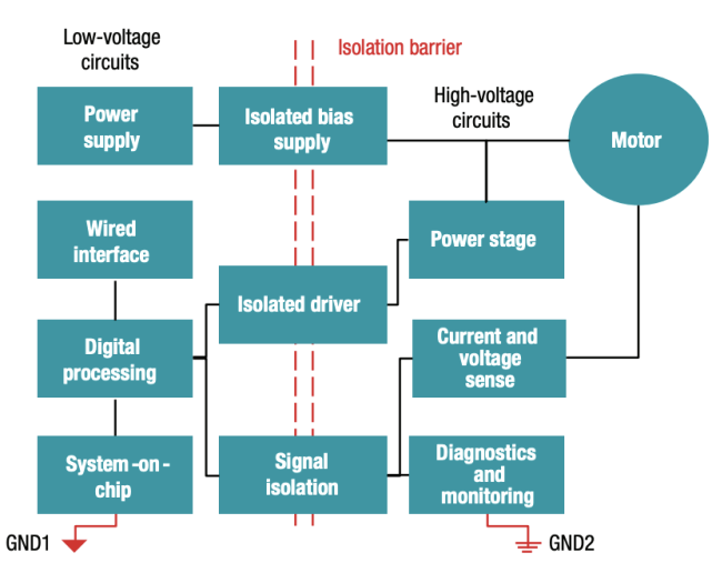 这包括初级侧的低电压通信、控制和主电源电路。次级侧具有高电压电路,包括 电机驱动器、功率级和其他电路。