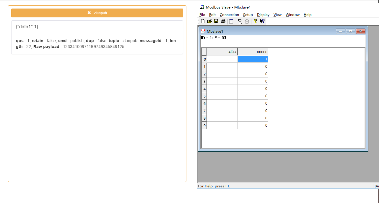 在电脑端用ModbusSlave虚拟一个ModbusTCP从站,并用MQTTBox创建一个MQTT Client,和ZLAN7146访问同一个MQTT服务器(Broker),并订阅7146的发布主题“zlanpub”,如下图所示,可以订阅到7146发布的JSON数据,是与ModbusSlave中的40001寄存器的数值一致的,说明功能测试成功。