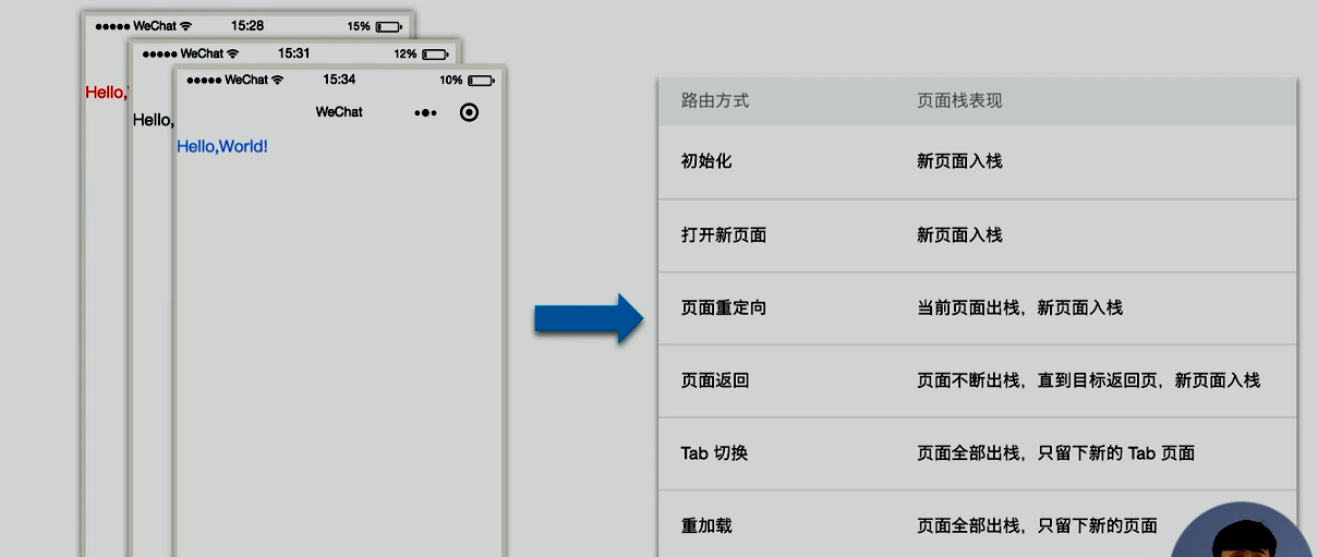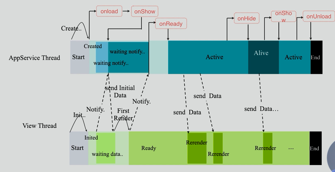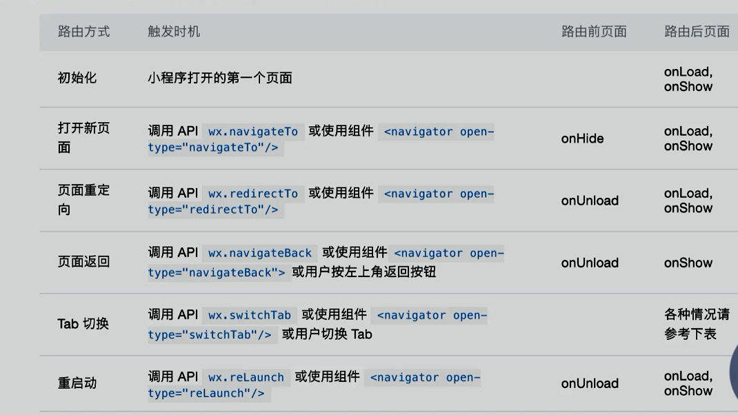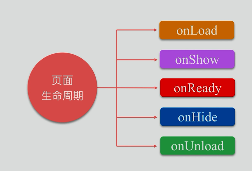 onload 初次加载,销毁之前只调一次 onshow(1.初次加载,2从其他页面再次返回这个页面调用) onReady 1次(之后就可以和逻辑层交互), onhide(按Home键就隐藏了),onunload(销毁)
