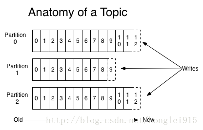 一个topic是对一组消息的归纳。对每个topic,Kafka 对它的日志进行了分区,如下图所示: