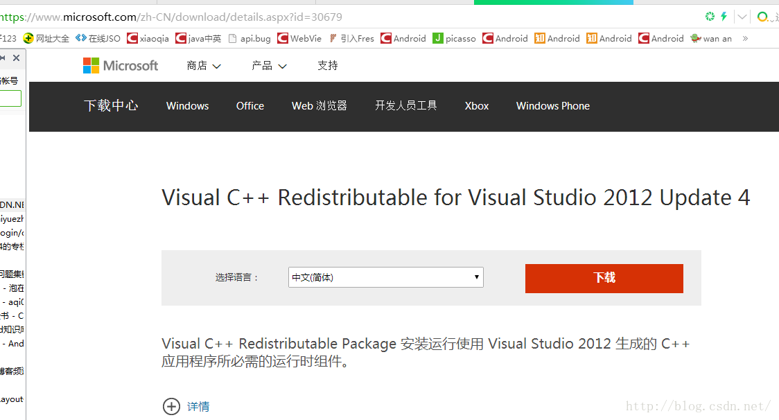 在浏览器的地址栏里输入 http://www.microsoft.com/zh-CN/download/details.aspx?id=30679 这个网址来进行相关程序的下载。