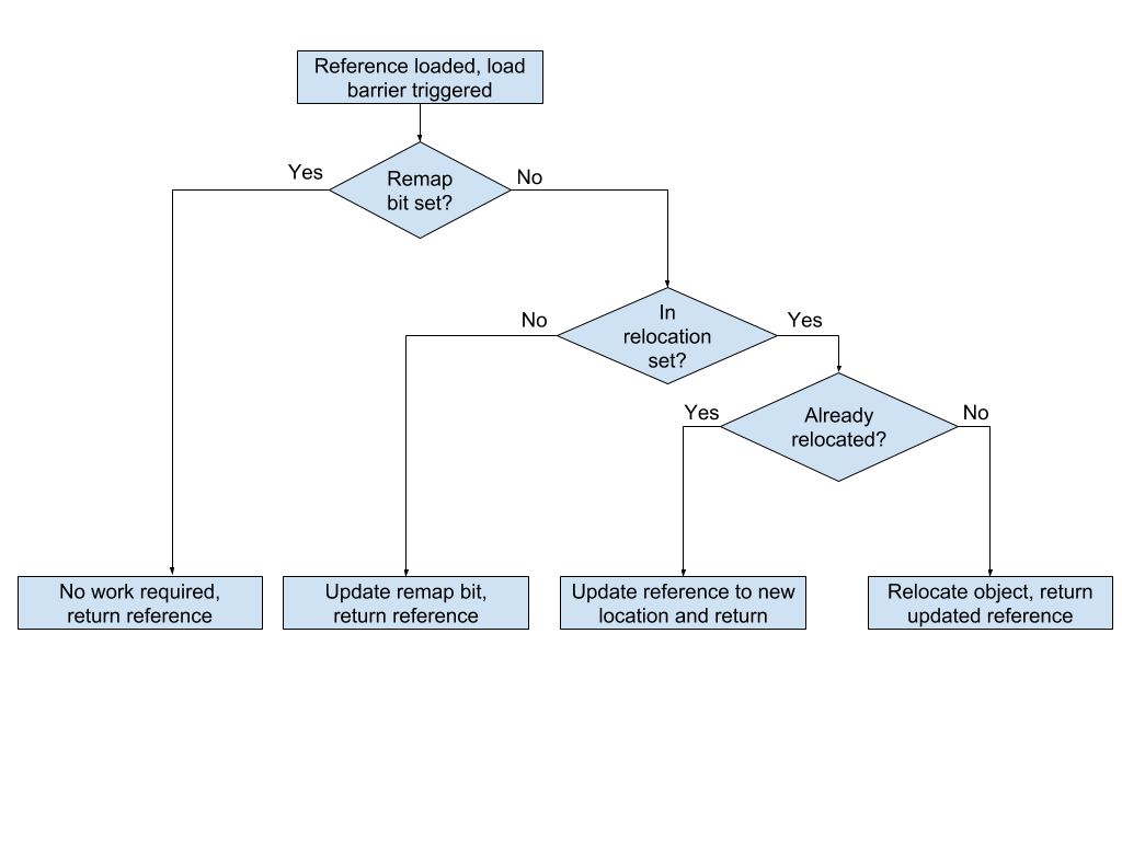 这与其他GC使用的写屏障形成对比,例如G1。读屏障的工作是检查引用的状态,并在将引用(或者甚至是不同的引用)返回给应用程序之前执行一些工作。 在ZGC中,它通过测试加载的引用来执行此任务,以查看是否设置了某些位。 如果通过了测试,则不执行任何其他工作,如果失败,则在将引用返回给应用程序之前执行某些特定于阶段的任务。