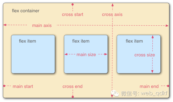 容器默认存在两根轴:水平的主轴(main axis)和垂直的交叉轴(cross axis)。主轴的开始位置(与边框的交叉点)叫做main start