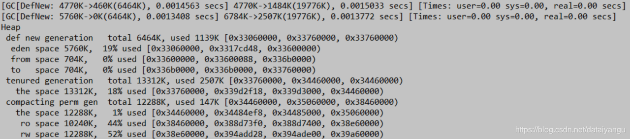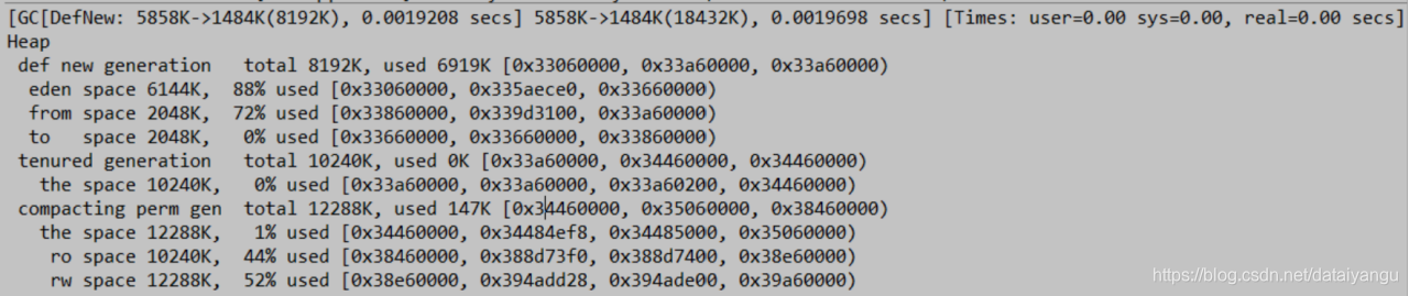 DefNew: 4416K->0K(4928K), 0.0001897 secs表示这是一个新生代的gc