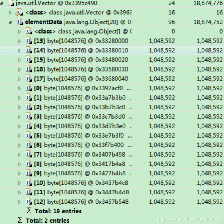 上面就是dump出来的文件,可以看到已经分配了19个byte数组,每个数组1m,再次分配超过了-Xmx20m最大堆内存。