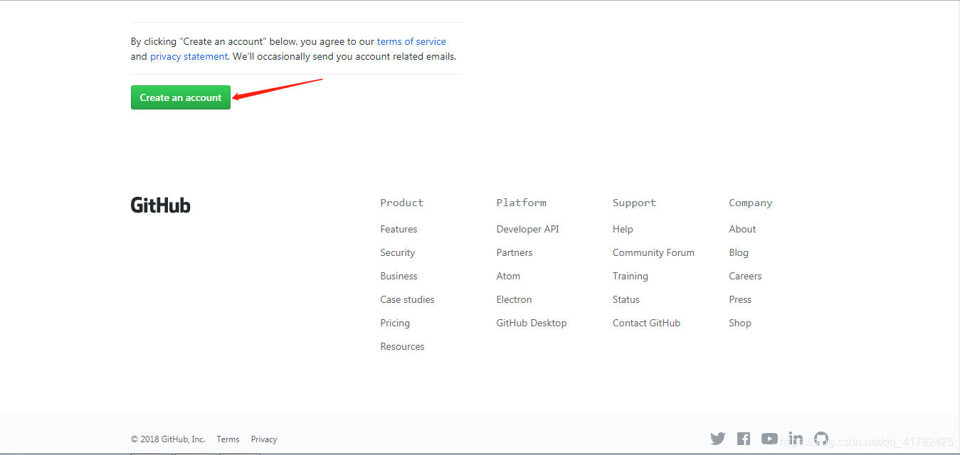 4.填写完用户名 丶邮箱地址丶密码后,点击下面的Create an account按钮,如下图所示: