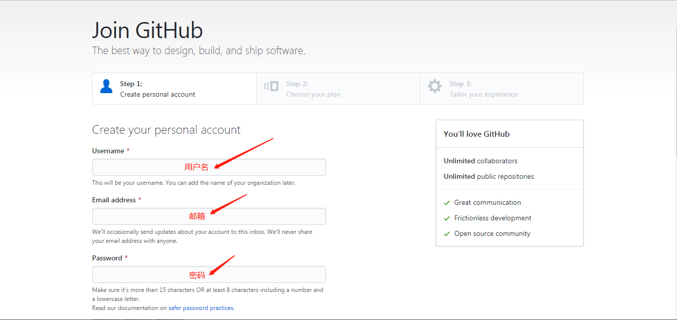 4.填写完用户名 丶邮箱地址丶密码后,点击下面的Create an account按钮,如下图所示: